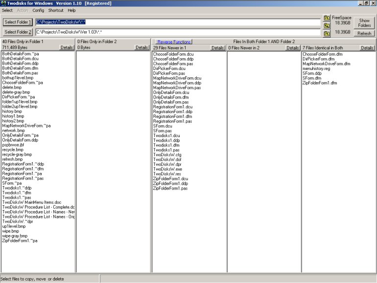TwoDisks for Windows reads two different folders and compares them. It displays the results of the comparison in five different panes...those files only in "Folder 1", those files only in "Folder 2", those files that are in both folders that are NEWER in "Folder 1", NEWER in "Folder 2", and finally those that are identical in both folders.